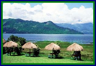 ancho. La rodean escarpadas colinas cubiertas de vegetación hasta